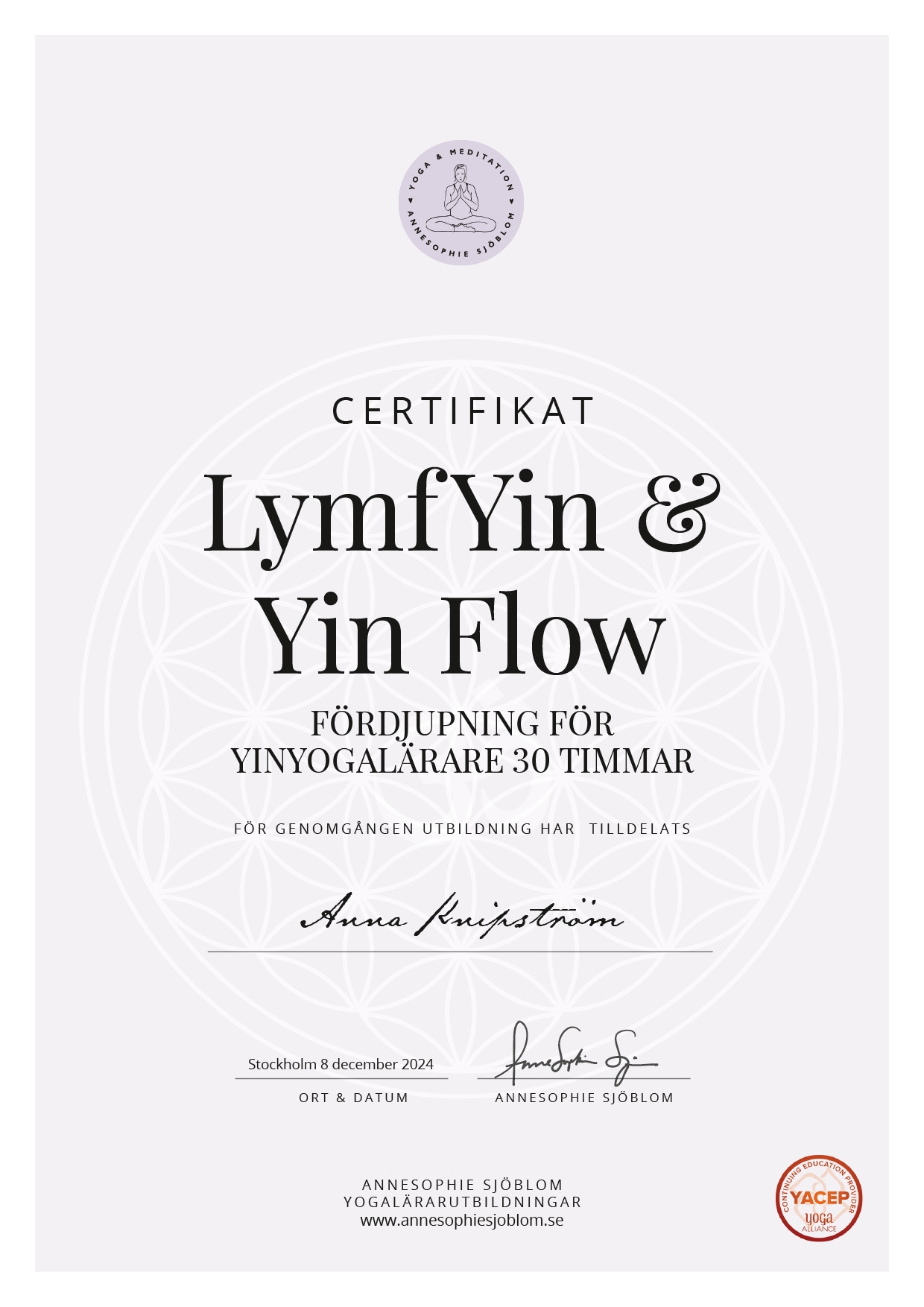 ”Tack AnneSophie för en mycket bra utbildning för oss som har lärarutbildning i yinyoga. För mig var det toppen att få ta del av den digitala delen innan utbildningen. Det kurskompendium som ingår i utbildningen är mycket pedagogiskt och bra. Här finns allt man vill veta om lymfsystemet, tydliga instruktioner om hur yogapositionerna ska utövas och fyra lymfyin pass. Dessa lymfyin pass finns också som filmer i den digitala utbildningen. Kursen överträffade mina högt ställda förväntningar. Än en gång tack för en jättebra utbildning!”